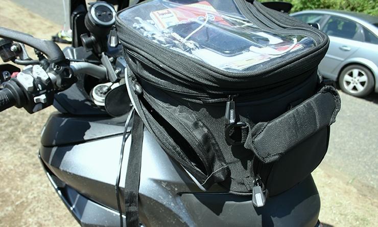 У меня есть сумка на бак, купленная у дилера Ducati по каталогу аксессуаров для Multistrada. Вообще эту сумку делают Givi, и она довольно хитро крепится к крышке бака. В её большое центральное отделение вмещаются запасные перчатки, документы, бутылка с водой и замок на диск. В прозрачный пластиковый отсек наверху удобно положить телефон, но учтите, что по жаре он там моментально перегревается. Вообще традиционно этот отсек делают под бумажные карты, и возможно, стоит сохранить эту традицию.