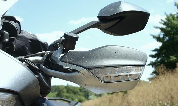 Лопухи на руле Ducati Multistrada со встроенными поворотниками, я бы сказал, хлипковаты. В случае столкновения они вряд ли что-то всерьёз защитят, но зато они неплохо отводят дождь и ветер.